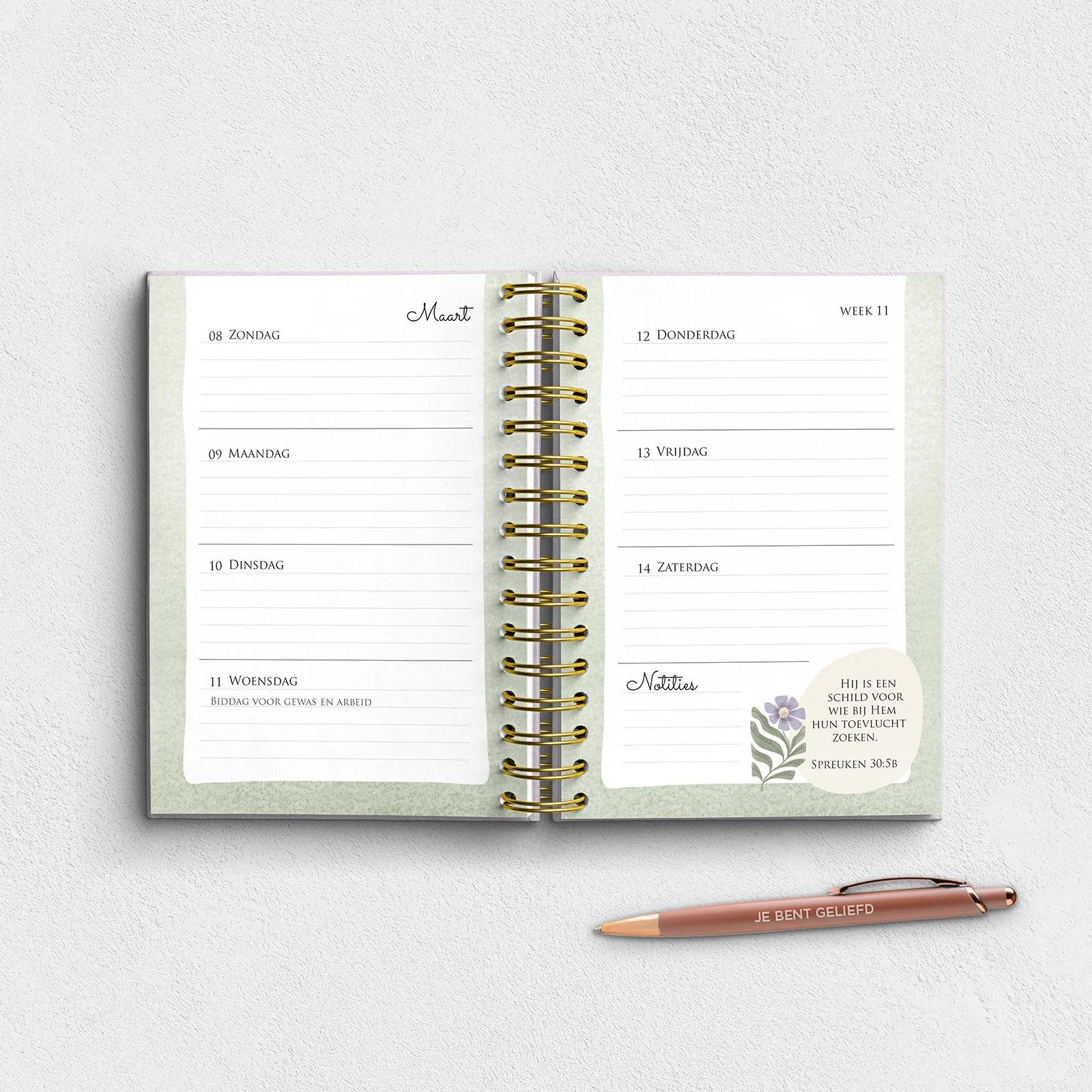 Kleur je jaar met deze A5-agenda van Marjolein’s Creations. Elke maand een prachtige tekening met Bijbeltekst, elke week een detail uit die illustratie. Voorzien van ringband, veel ruimte om te schrijven en een weekstart op zondag.