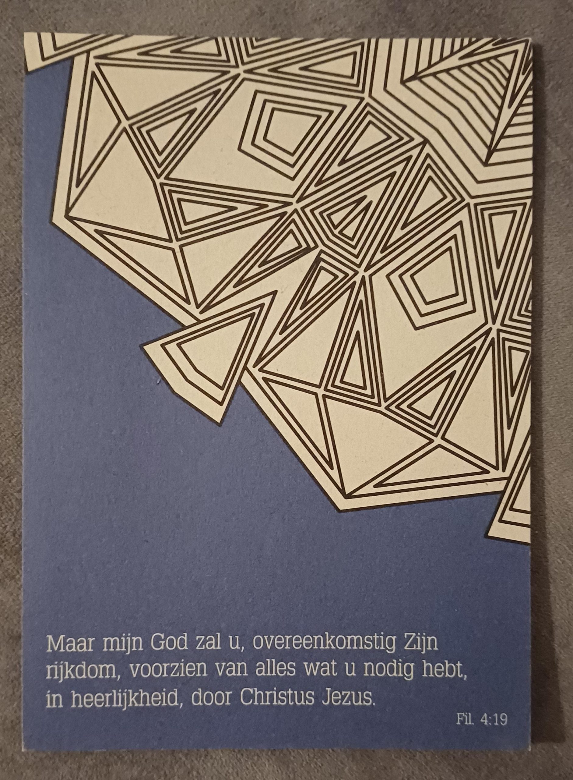 Tekst: Maar mijn God zal u, overeenkomstig Zijn rijkdom, voorzien van alles wat u nodig hebt, in heerlijkheid, door Christus Jezus. Fil. 4:19. Incl. envelop.