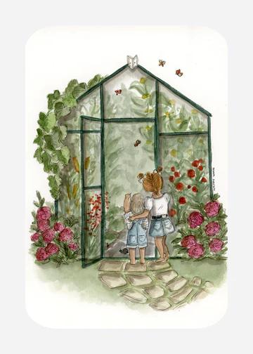 Leuke ansichtkaart met afgeronde hoeken en sfeervolle tekening van een kas en twee kleine kindertjes ervoor.