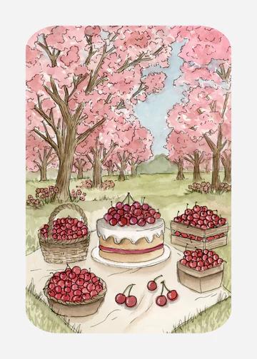 Leuke ansichtkaart met afgeronde hoeken en sfeervolle tekening van een kersenboomgaard.