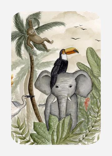Leuke ansichtkaart met afgeronde hoeken en sfeervolle tekening van een Olifant met een toekan op zijn kop.