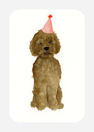 Leuke ansichtkaart met afgeronde hoeken en sfeervolle tekening van een poedel met een feesthoedje op.