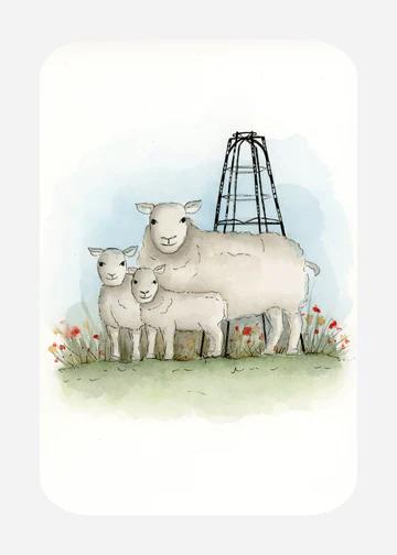 Leuke ansichtkaart met afgeronde hoeken en sfeervolle tekening van een schaap met lammetjes.