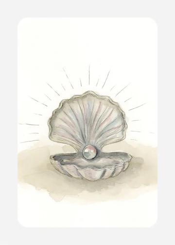 Leuke ansichtkaart met afgeronde hoeken en sfeervolle tekening van een schelp met een parel erin.