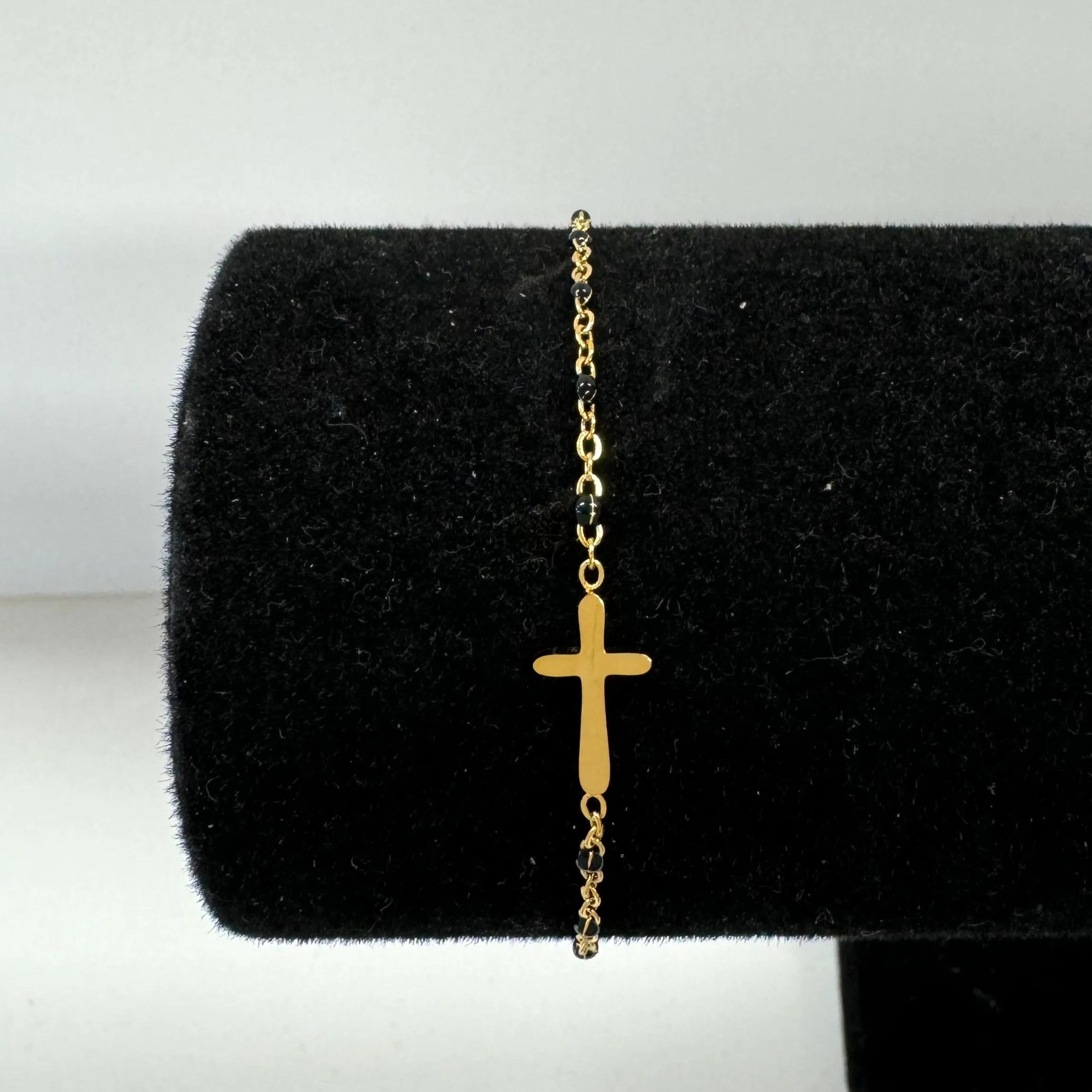 Stijlvol armbandje met kraaltjes en een klein kruisje – een subtiele manier om jouw geloof te laten zien.