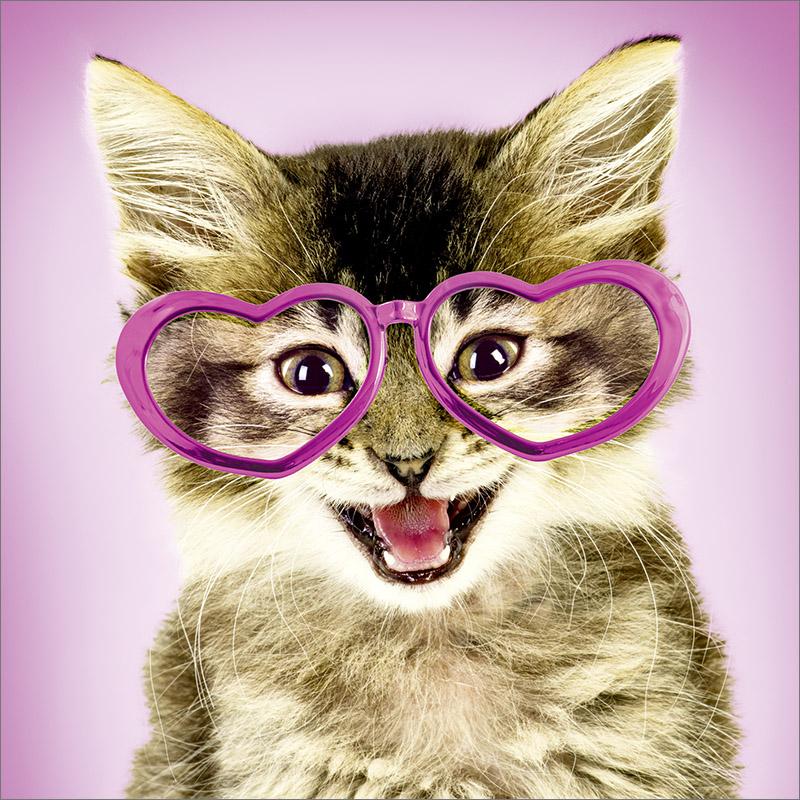 Kaart met een vrolijke poes met bril
