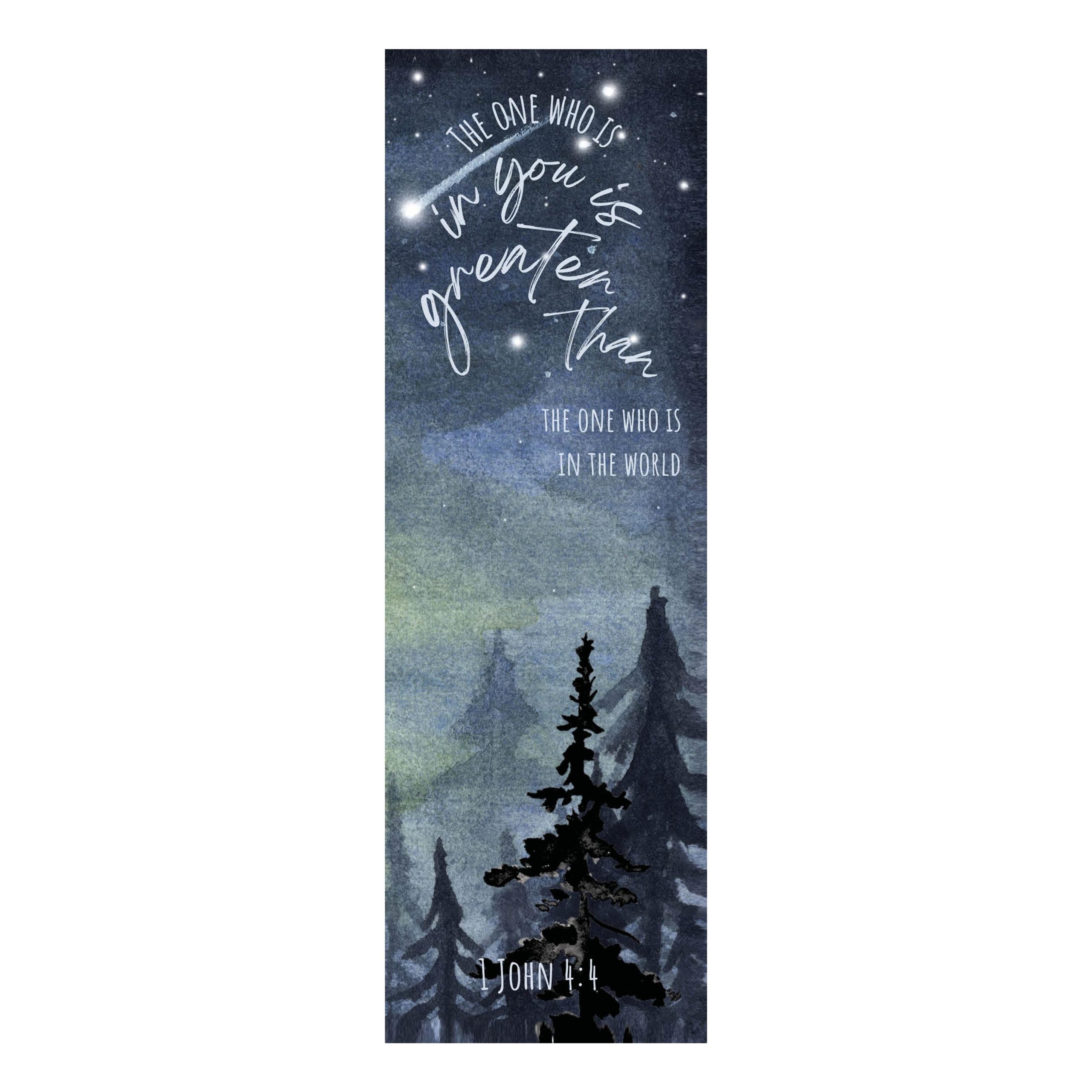 Herinner jezelf aan Gods kracht met deze sfeervolle boekenlegger, geïnspireerd op 1 Johannes 4:4. Deze boekenlegger herinnert je aan Gods aanwezigheid, zelfs in het donker.