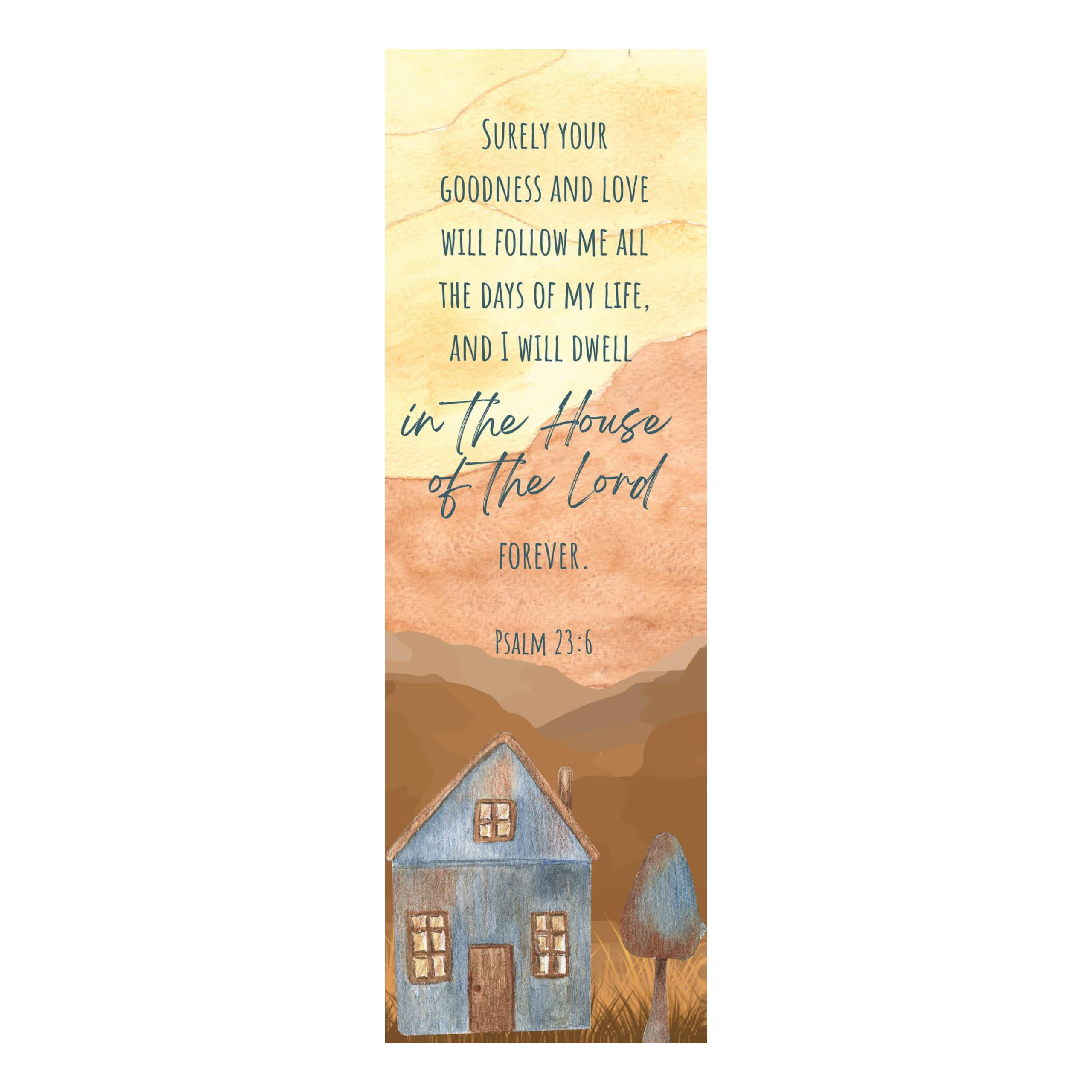 Een beeld van geborgenheid en beloofde rust – geïnspireerd door Psalm 23:6. Deze boekenlegger herinnert aan Gods trouwe nabijheid, dag in dag uit, en het diepe verlangen om altijd thuis te zijn bij Hem.