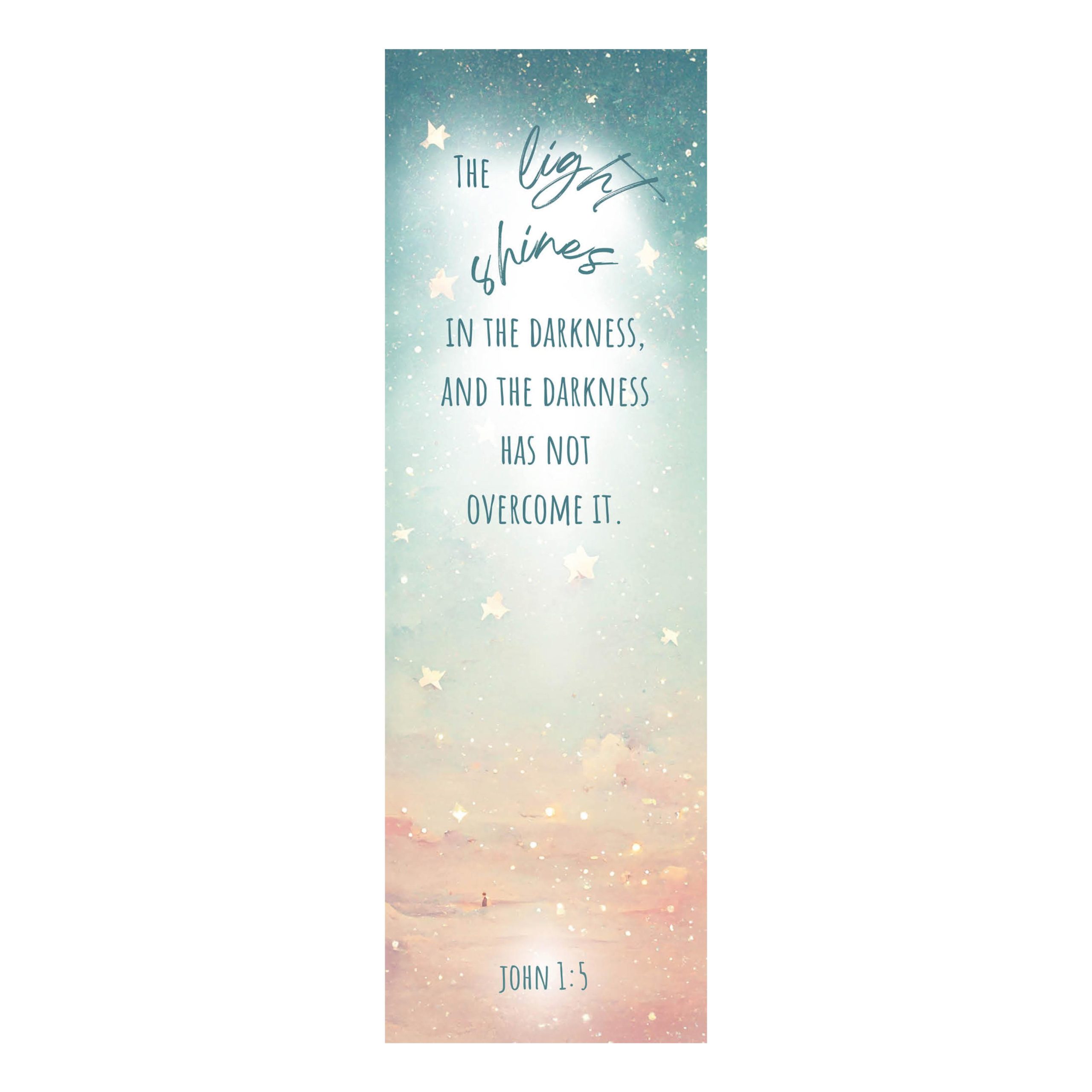 Laat je raken door de hoopvolle waarheid van Johannes 1:5. Deze boekenlegger verbeeldt hoe het Licht – zelfs in het diepst van de duisternis – blijft schijnen. Een beeld van hoop, aanwezigheid en eeuwig licht, zelfs wanneer alles om je heen stil lijkt.