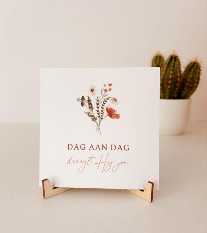 Het bordje wordt geleverd met een stijlvolle houten standaard, speciaal op maat gemaakt. Hierdoor kun je het eenvoudig neerzetten op bijvoorbeeld een bureau, plank of vensterbank.