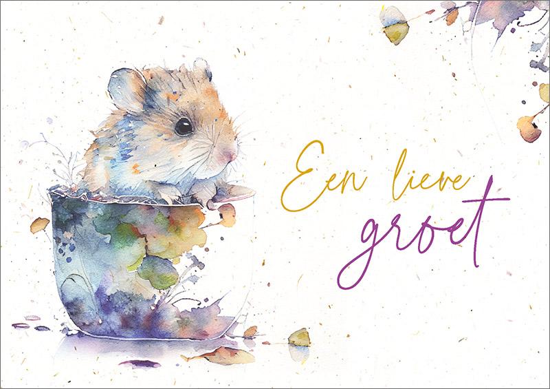 Dubbele natuurlijke kaart met tekst Een lieve groet en een muisje in een kopje.