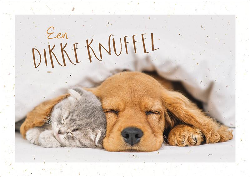 Leuke kaart met Slapend poesje onder het oor van een slapend hondje en de tekst Een dikke knuffel.
