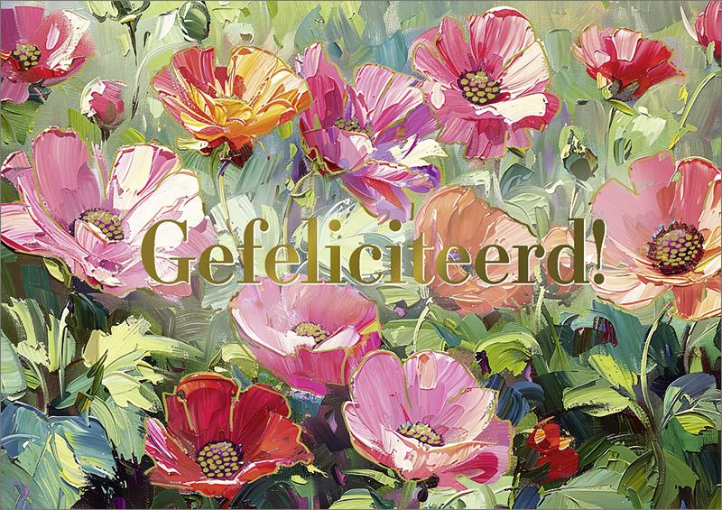 Gefeliciteerd! Fleurige dubbele kaart met gekleurde bloemen erop. Goudkleurige accenten.