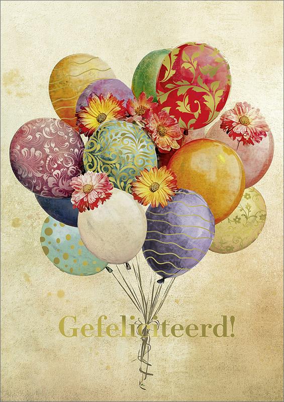 Mooie dubbele kaart met ballonnen en bloemetjes met de tekst: Gefeliciteerd!