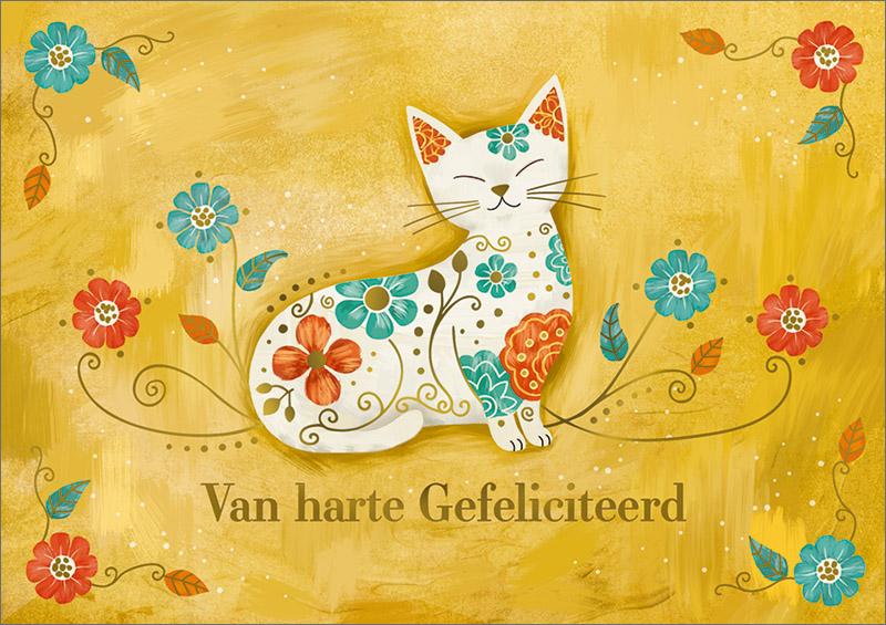 Leuke dubbele kaart met afbeelding van een poes met de tekst van harte gefeliciteerd