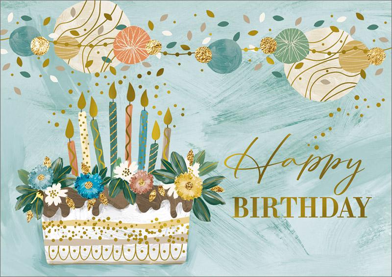 Leuke dubbele kaart met tekst Happy birthday en een verjaardagstaart met 8 vrolijke kaarsen en bloemen erop. Met goudkleurige accenten.