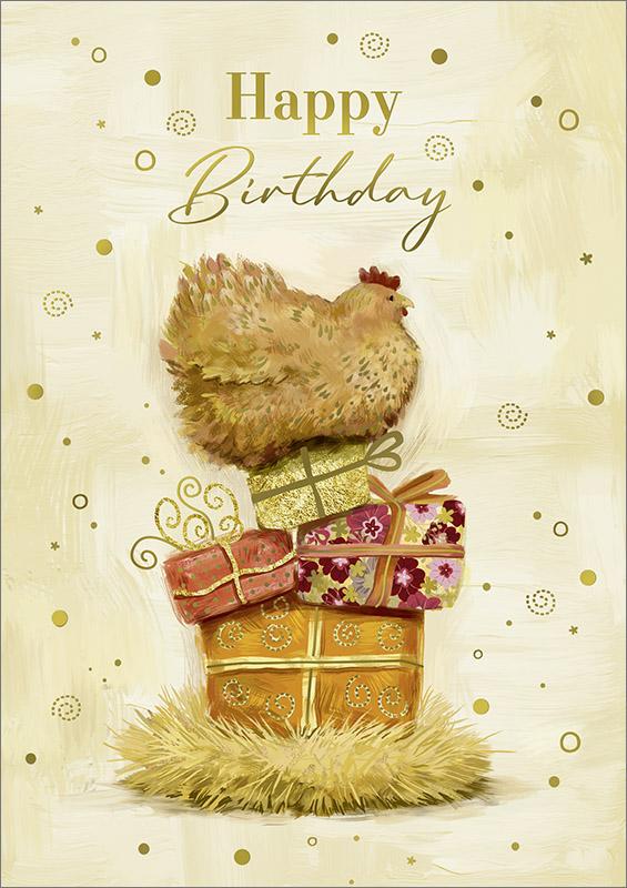 Leuke dubbele kaart met een kip die bovenop een stapel kado's zit en de tekst happy birthday