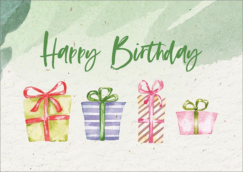 Leuke kaart met tekst: Happy Birthday en afbeelding van cadeautjes.