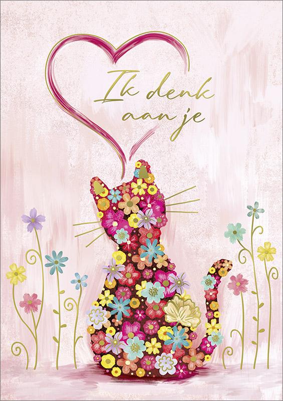Leuke roze kaart met een poes gemaakt van bloemen en er boven een hart met de tekst ik denk aan je