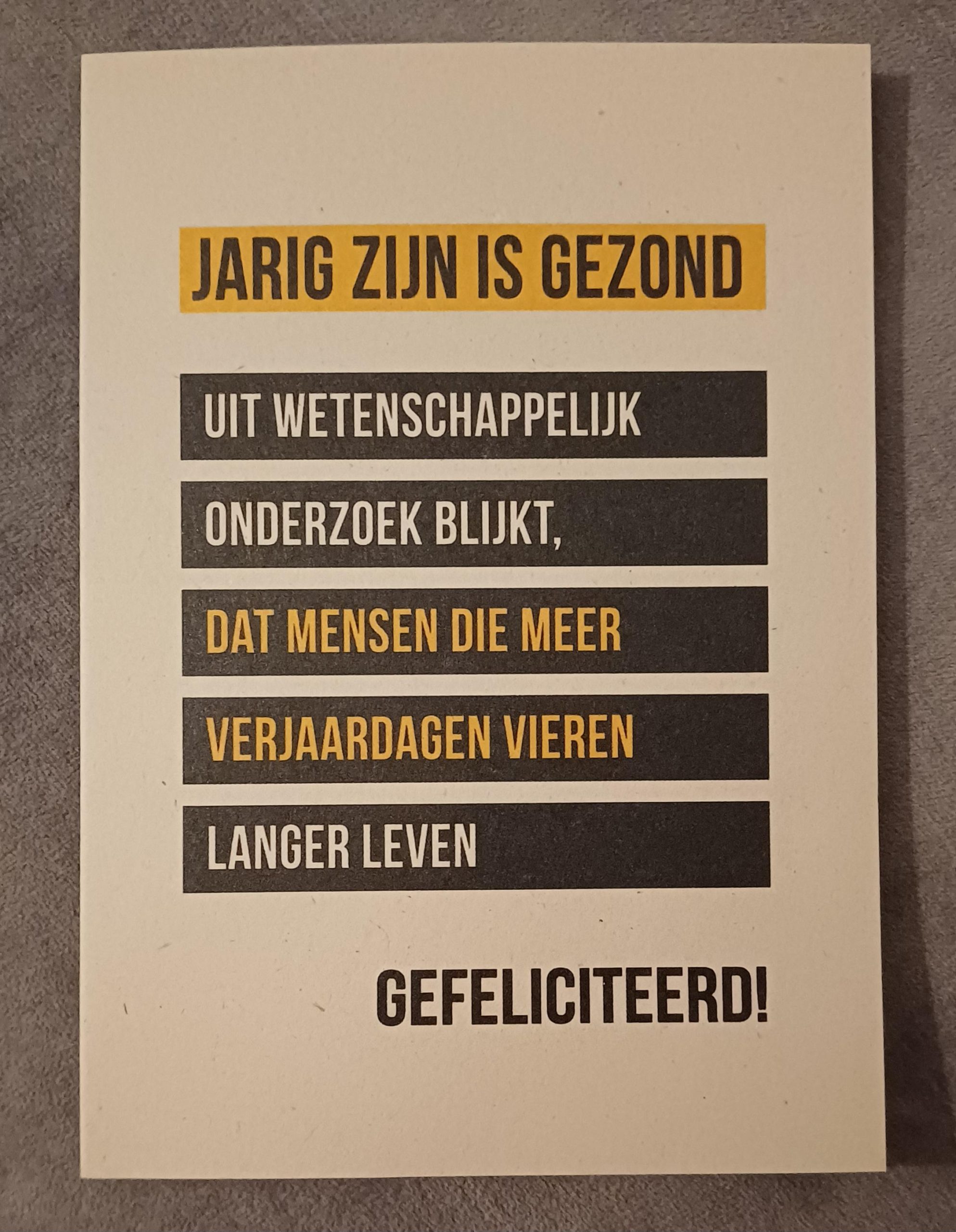 met tekst: Jarig zijn is gezond. Uit wetenschappelijk onderzoek blijkt, dat mensen die meer verjaardagen vieren langer leven. Gefeliciteerd! Incl. envelop.