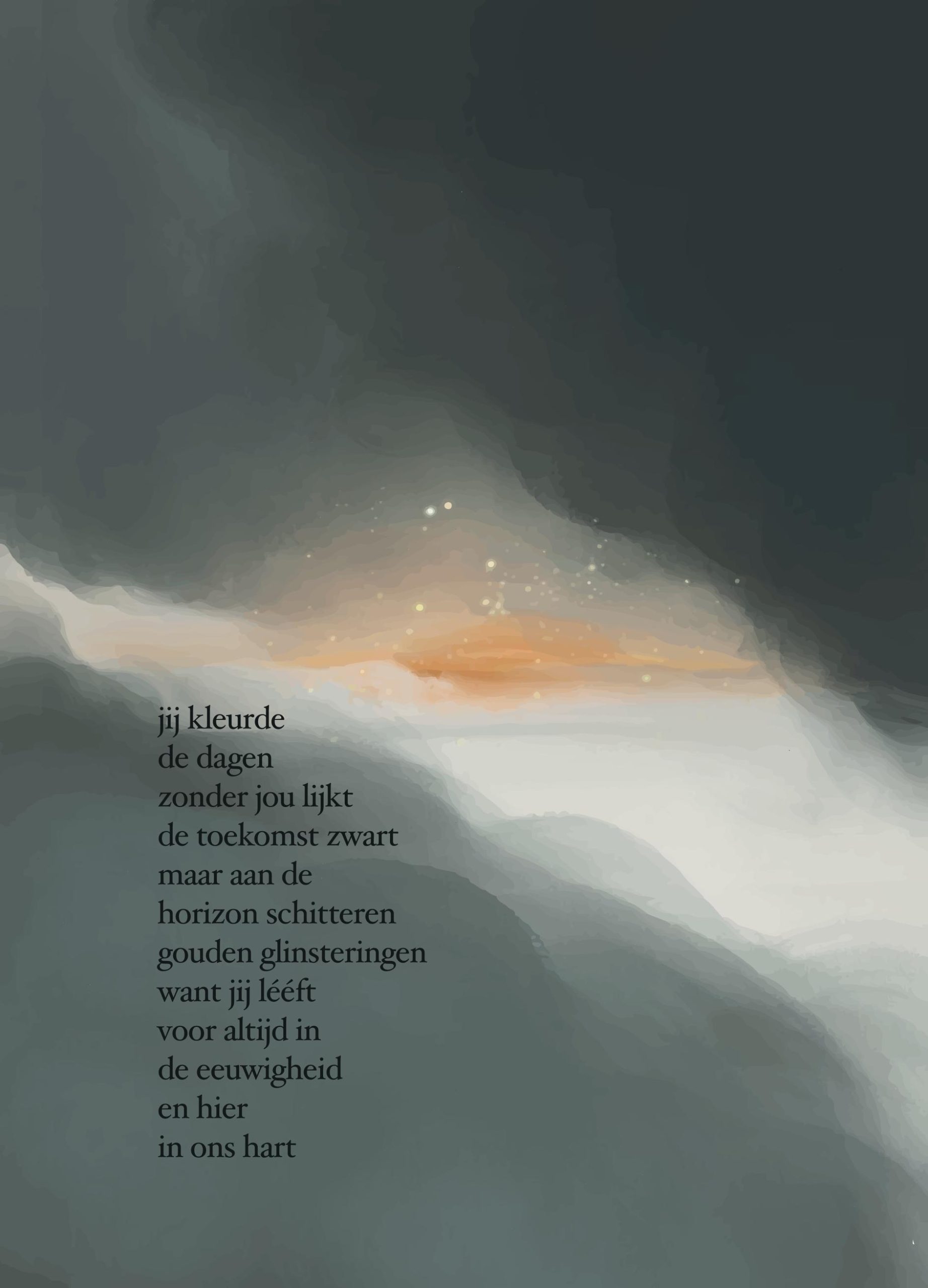 Jij kleurde de dagen zonder jou lijkt de toekomst zwart maar aan de horizon schitteren gouden glinsteringen want jij lééft voor altijd in de eeuwigheid en hier in ons hart." gedrukt op duurzaam en stevig 300 grams papier met een matte look. Incl. envelop.