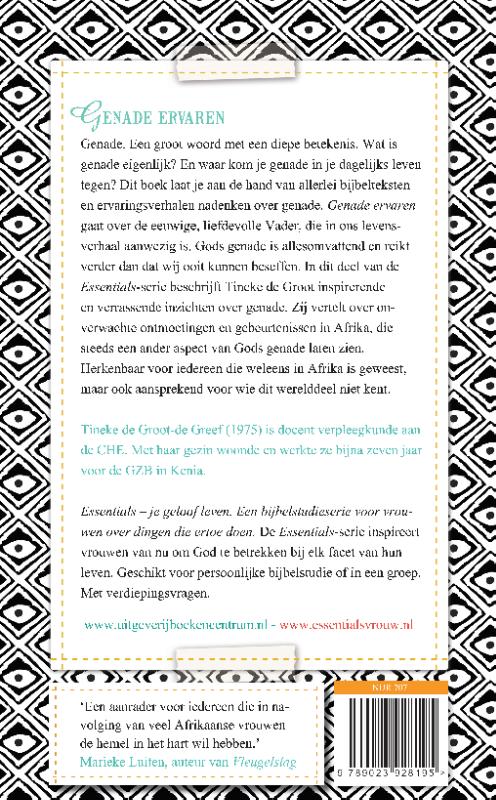 Dit boek laat je aan de hand van allerlei bijbelteksten en ervaringsverhalen nadenken over genade. Genade ervaren gaat over de eeuwige, liefdevolle Vader, die in ons levensverhaal aanwezig is. Gods genade is allesomvattend en reikt verder dan dat wij ooit kunnen beseffen. In dit deel van de Essentials-serie beschrijft Tineke de Groot inspirerende en verrassende inzichten over genade. Zij vertelt over onverwachte ontmoetingen en gebeurtenissen in Afrika, die steeds een ander aspect van Gods genade laten zien.Herkenbaar voor iedereen die weleens in Afrika is geweest, maar ook aansprekend voor wie dit werelddeel niet kent.