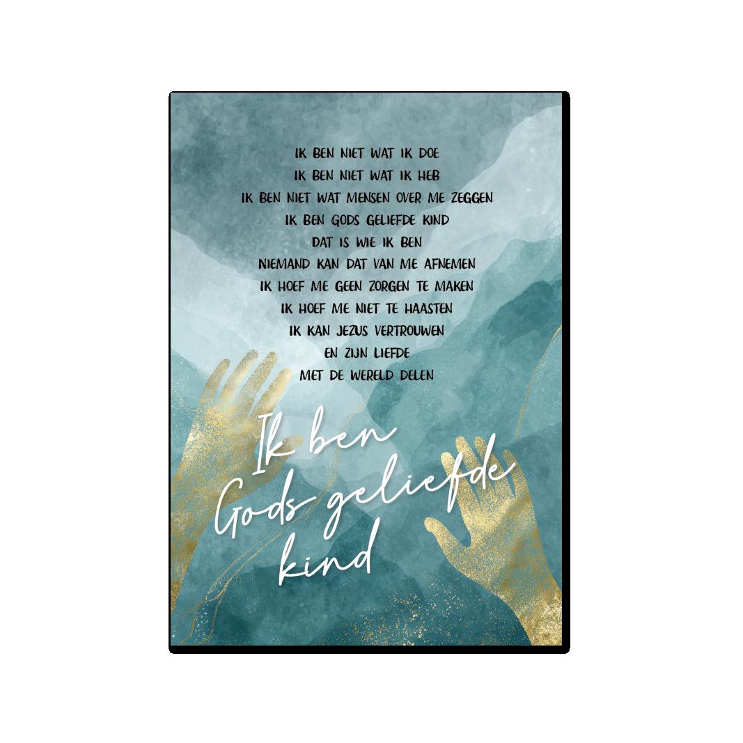 Ansichtkaart Gods geliefde kind is een mooie kaart met een Bijbelse waarheid. De volledige tekst luidt: “Ik ben niet wat ik doe, ik ben niet wat ik heb, ik ben niet wat mensen over me zeggen. Ik ben Gods geliefde kind. Dat is wie ik ben. Niemand kan dat van me afnemen. Ik hoef me geen zorgen te maken. Ik hoef me niet te haasten, ik kan Jezus vertrouwen en Zijn liefde met de wereld delen. Ik ben Gods geliefde kind.” Formaat A6. Excl. envelop