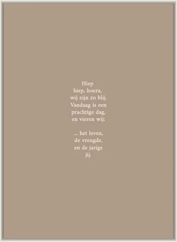 Enkele kaart Hiep, hiep, hoera, wij zijn zo blij. Vandaag is een prachtige dag, en vieren wij: … het leven, de vreugde, en de jarige jij. © Huis van Mijn