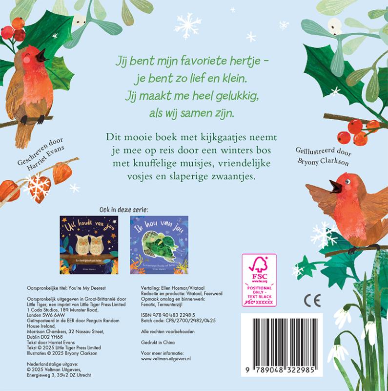 Dit mooie boek met kijkgaatjes neemt je mee op reis door een winters bos met knuffelige muisjes, vriendelijke vosjes en slaperige zwaantjes.