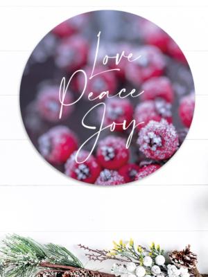 Rond bord voor aan de wand of om neer te zetten. Tekst: Love, Peace, Joy.