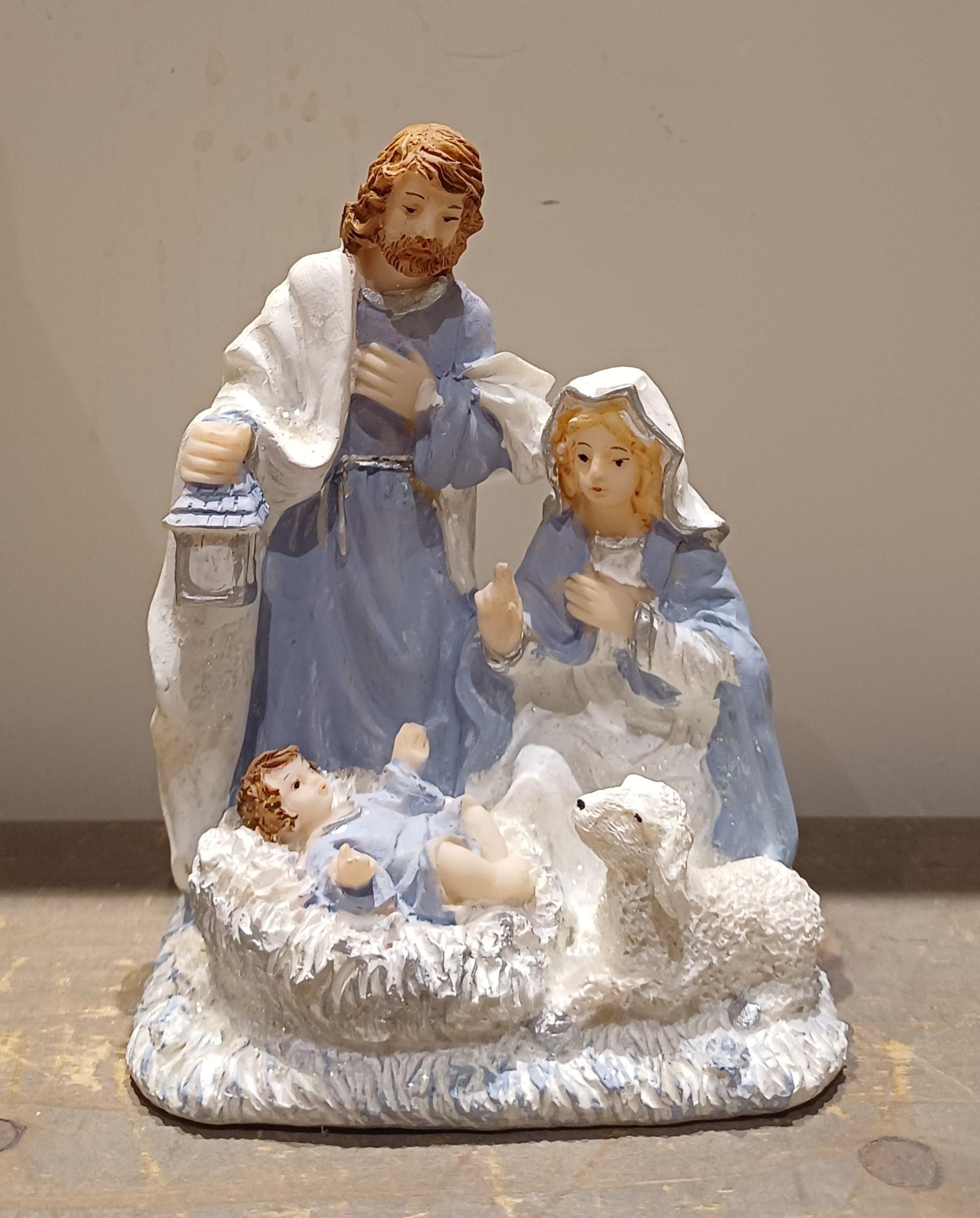 Mooie kerstgroep van Jozef, Maria en Jezus in wit, blauw en zilverkleur.