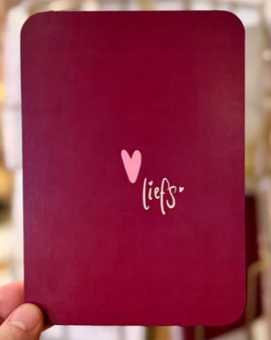 Mooie ansichtkaart in wijnrood met een hartje en de tekst: Liefs.