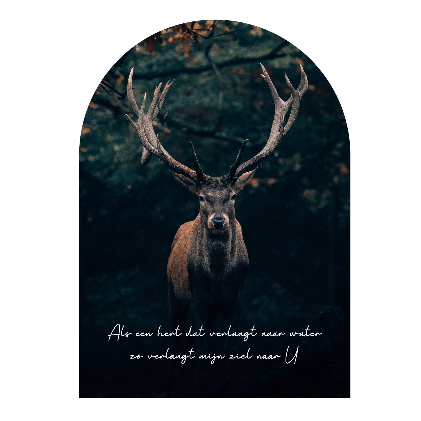 Afbeelding van een hert in het bos met tekst: Als een hert dat verlangt naar water zo verlangt mijn ziel naar U