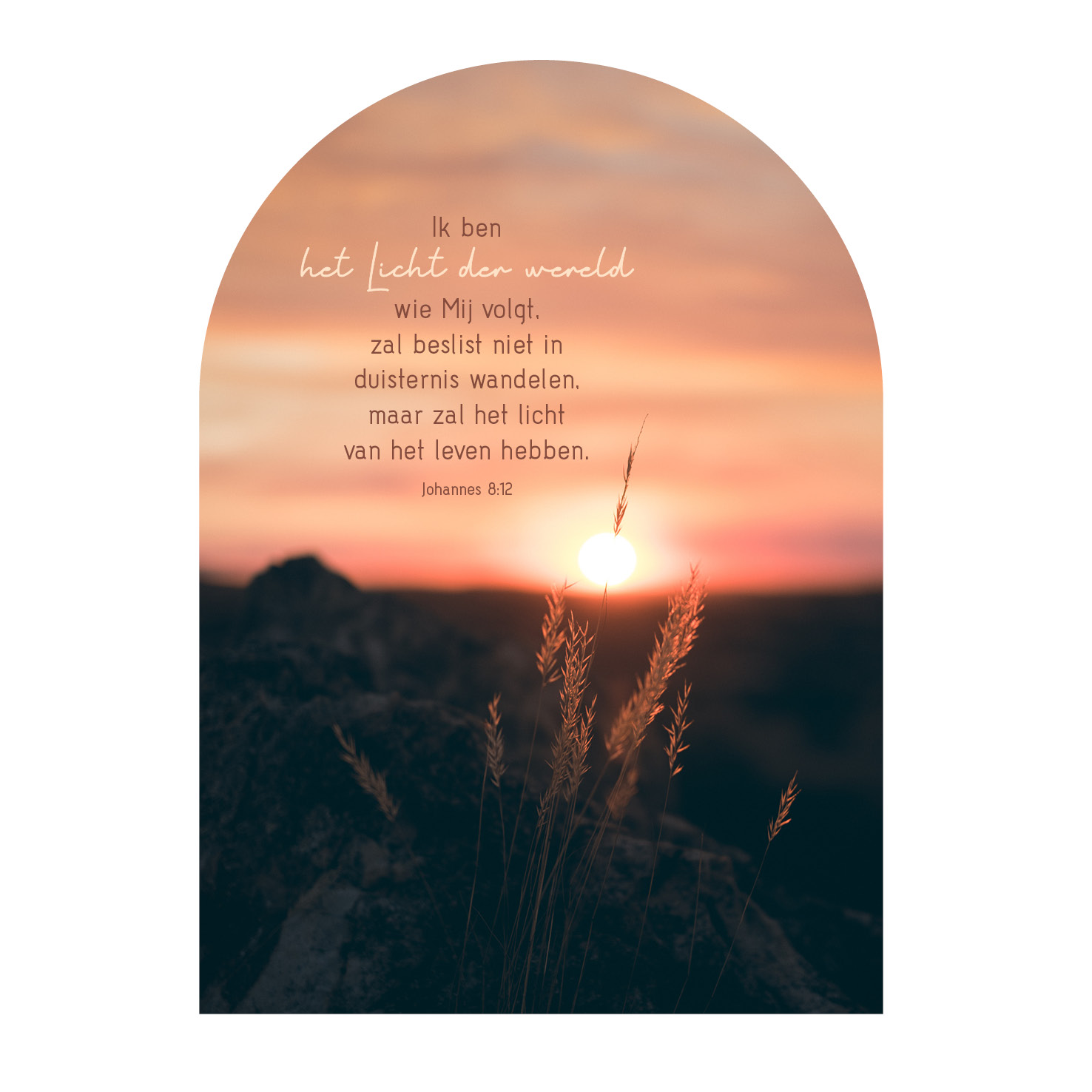 Afbeelding van zonsopgang met tekst: Ik ben het Licht der wereld wie mij volgt, zal beslist niet in duisternis wandelen. Maar zal het licht van het leven hebben.