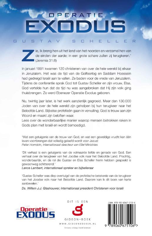 Het was de tijd van de Golfoorlog en Saddam Hoessein had gedreigd Israël aan te vallen. Ze baden voor de vrede van Jeruzalem. Tijdens de conferentie sprak God tot Gustav Scheller en zijn vrouw, Elsa. God vertelde hun dat de tijd nu was aangebroken dat Hij zijn volk ging thuisbrengen. Zo werd Ebenezer Operatie Exodus geboren.Nu, twintig jaar later, is het werk aanzienlijk gegroeid. Meer dan 130.000 Joden van over de hele wereld zijn geholpen bij hun terugkeer naar het Beloofde Land. Bijbelse profetieën gaan in vervulling; God is trouw aan zijn Woord en maakt zijn beloften waar. Lees over de wonderbaarlijke manier waarop mensen betrokken raken in Gods plan met Israël en wordt bemoedigd. Aanbevelingen Wat een getuigenis van de trouw van God, en wat een geweldige vrucht kan één leven voortbrengen dat volledig geleefd wordt voor Jezus! Peter Horrobin, Internationaal directeur van Ellel MinistriesDit verhaal is een getuigenis van de volmaakte liefde en genade van God. Een verhaal over de terugkeer van het Joodse volk naar het Beloofde Land. Prachtig, wonderbaarlijk, en de rol die Gustav en Elsa Scheller hierin hebben gespeeld is gewoonweg schitterend.Lance Lambert, internationaal spreker en bijbelleraarGustav Scheller was diep overtuigd van de profetische betekenis van de terugkeer van het Joodse volk naar het Beloofde Land. Daarom kan ik dit boek van harte aanbevelen.Willem Glashouwer, internationaal president Christenen voor Israël.