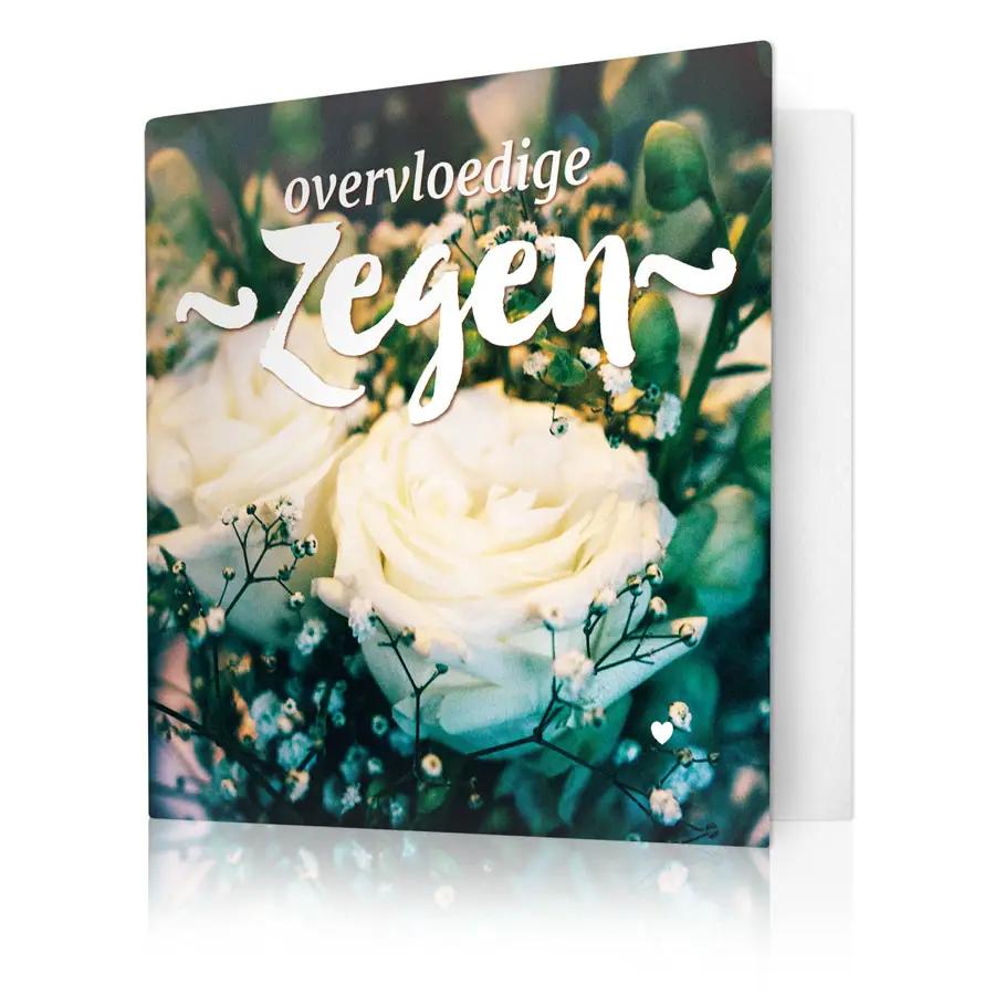 Mooie dubbele vierkante kaart met afbeelding van een roos en de tekst: Overvloedige zegen.