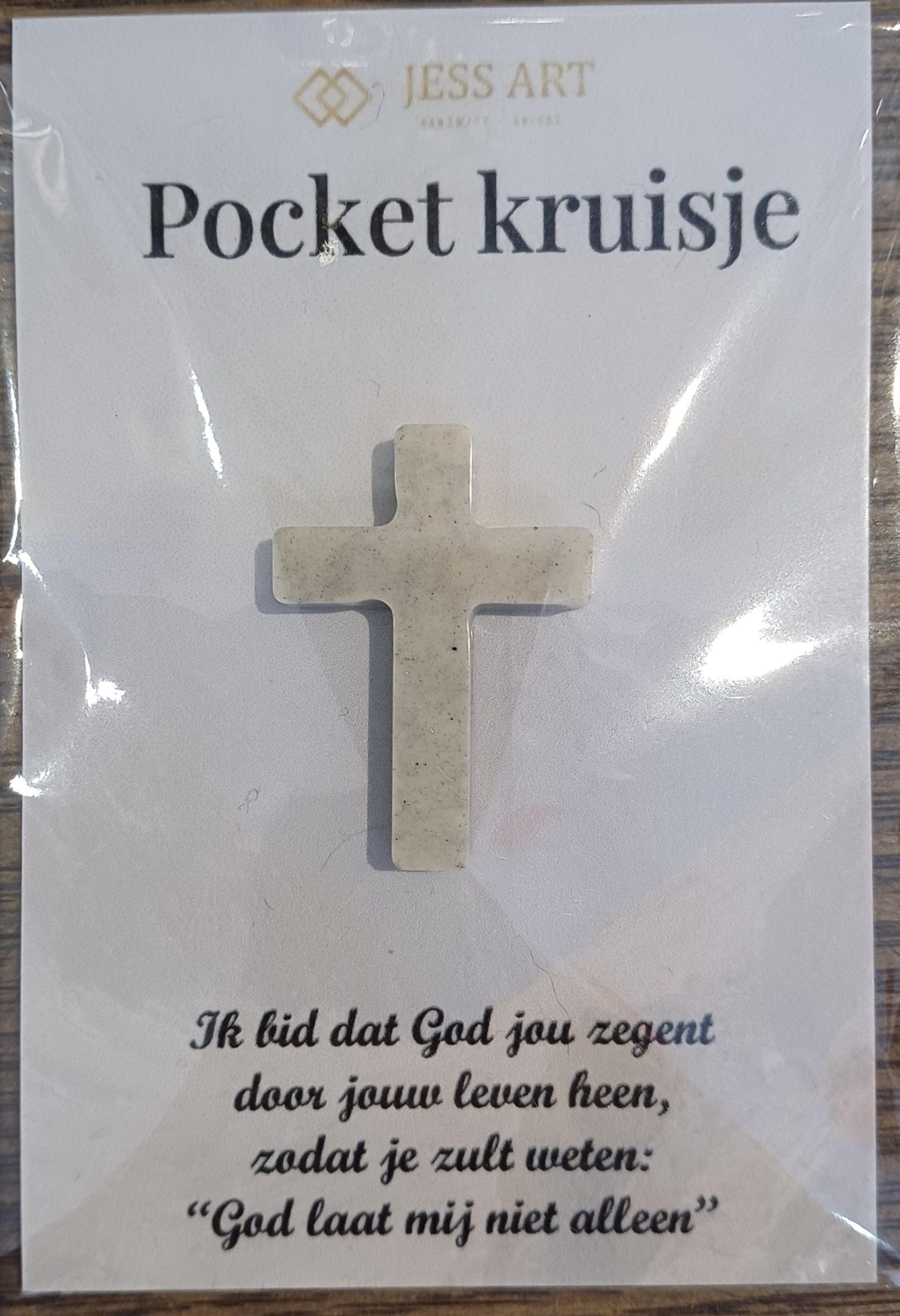 Kaartje met pocketkruisje in wit met tekst.