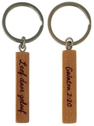 Sleutelhanger van hout met tekst: Leef door geloof, galaten 2:20.