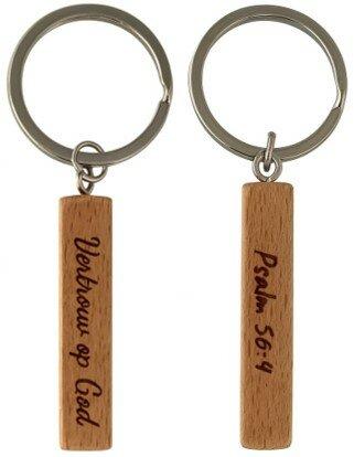Sleutelhanger van hout met tekst: Vertrouw op God, psalm 56:4.