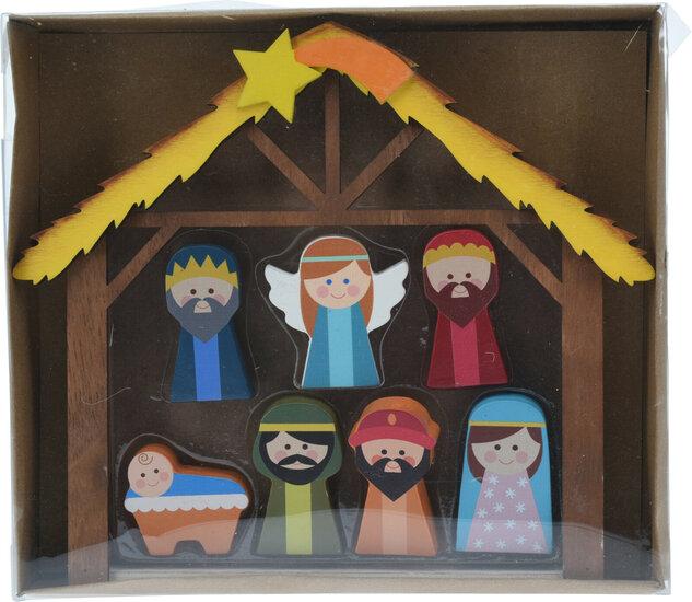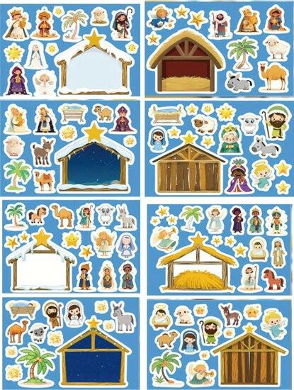 Leuk vel met kerststickers bestaande uit een stal met figuren, zoals Jozef, Maria en Jezus en daarnaast wijzen, herders of engelen.