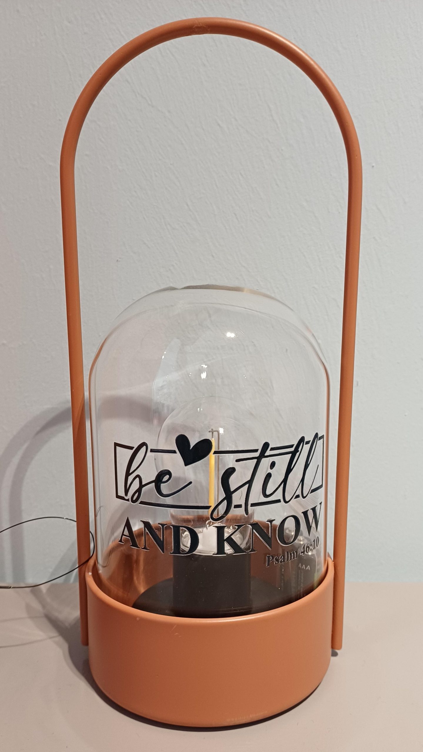 Leuke tafellamp in bruine kleur met tekst Be still and know