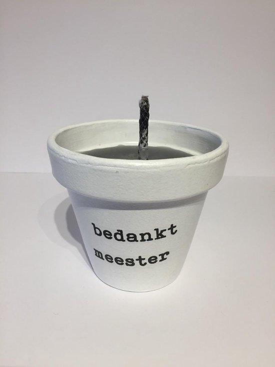 Kaars in wit potje met in het zwart de tekst: bedankt meester