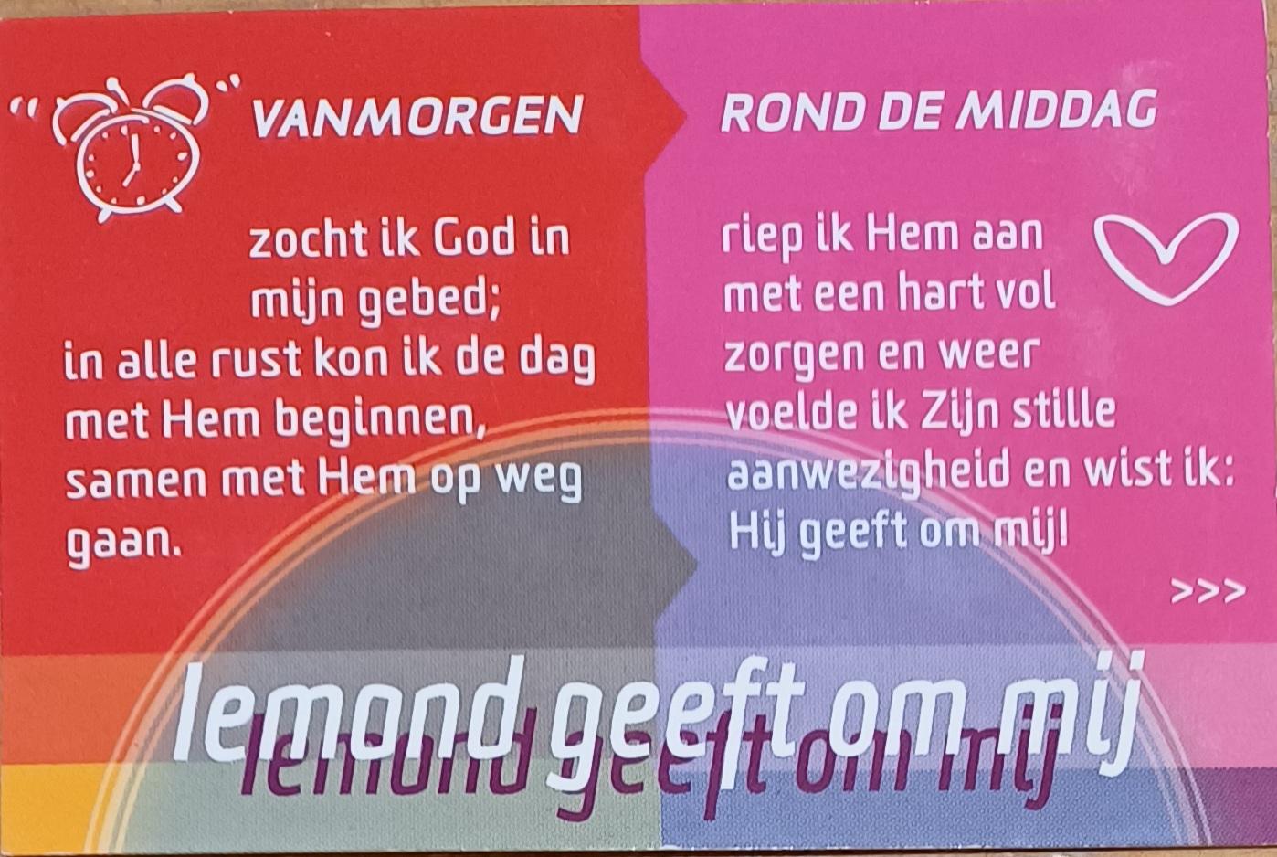 Vanmorgen zocht ik God in mijn gebed; in alle rust kon ik de dag met Hem beginnen. Samen met Hem op weg gaan. Rond de middag riep ik Hem aan met een hart vol zorgen en weer voelde ik Zijn stille aanwezigheid en wist ik: Hij geeft om mij!