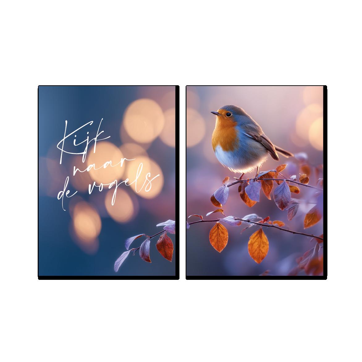 Prachtig tweeluik met een illustratie van een roodborstje en de tekst ‘Kijk naar de vogels’, verwijzend naar Mattheüs 6:26. Een sfeervolle toevoeging aan ieder interieur. Het tweeluik bestaat uit twee panelen van op A3-formaat, die samen één geheel vormen.