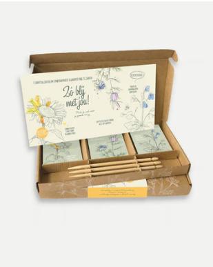 Met drie betekenisvolle soorten zaden: Zonnebloem, Juffertje-in-het-groen en Phacelia. Daarbij drie labels met stokjes om bij het potje of in de grond te steken. Op de kaart staat een vrolijke bos geïllustreerde bloemen en de tekst: 'Wie zorgt voor een ander zonder er iets voor terug te verwachten, wordt nooit teleurgesteld'. Doosje past door de brievenbus!